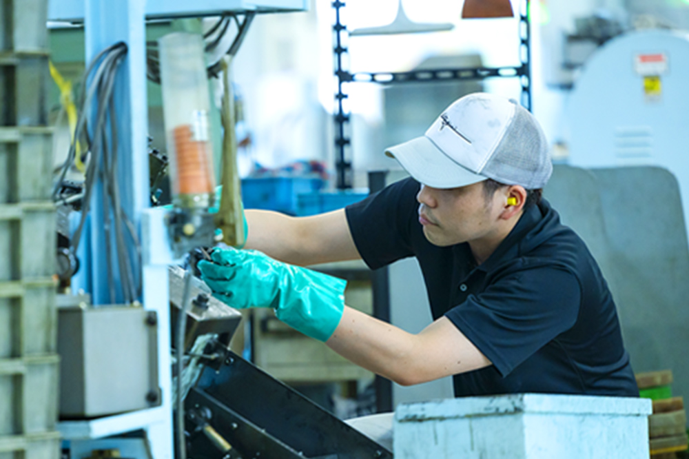 主に鍛造加工(金属を叩いて狙った形に変形させる加工方法で1台の設備で100個/分程度生産)技術を得意としています。